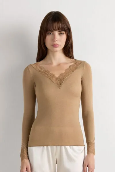Intimissimi Camiseta con encaje de manga larga en modal y cashmere ultraligero Mujer Marrón Tamaño S